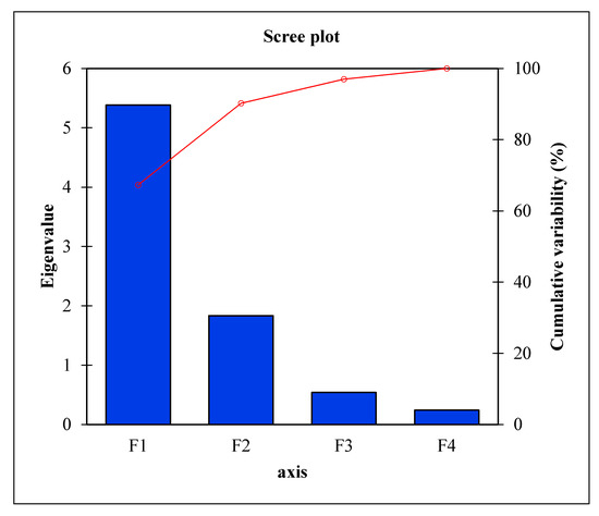 To have a better understanding of the influence of blanching conditions on the PSO quality, the multivariate data was subjected to principal component analysis (PCA). The eigenvalue measures the factor contribution to total variability. Eigenvalues greater than one are significant and therefore, the factors with the highest eigenvalues were considered the most important [58] (Figure 4). The first two principal components effectively separated the variables and observations and accounted for 90.23% of the total variation (Figure 5). The first factor (F1) was responsible for 67.30% of the total variation, whilst the second factor (F2) explained 22.94% of the total variation, demonstrating that the maximum possible variation in the oil quality due to blanching was explained by the F1. Positive scores on F1 corresponded with oil from PS blanched at 90 °C for 3 min. These variables were associated with oil yield and DPPH radical scavenging ability in addition to K232, K270 and RI. The higher oil yield obtained at this particular blanching condition could mean that higher amounts of K232 and K270 were proportionally generated, subsequently increasing the RI of the oil [41]. Negative scores on F1 corresponded with oil from unblanched PS as well as oil from PS blanched at 100 °C for 3 min and were associated with YI. This illustrates that improvements in oil yield and antioxidant activity were associated with decreases in the oil YI a phenomenon that can be explained by increased extractability of phenolic compounds and oxidation of color pigments such as carotenoids. Positive scores on F2 corresponded to oil from PS blanched at 90 °C for 5 min, that were correlated with TPC and TCC.