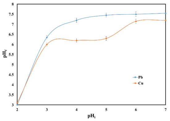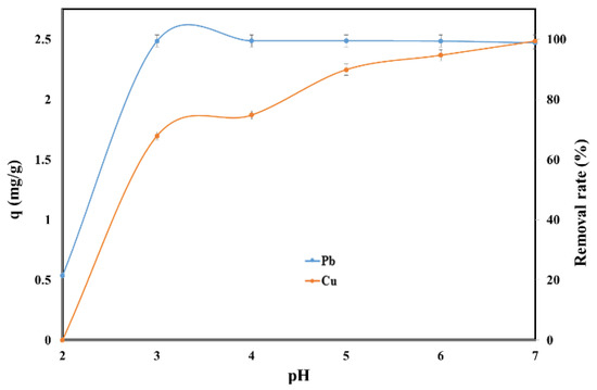 At pH higher than 7, the lead ions are efficiently removed from solution, but in this case were not removed due to an adsorption process but were removed due to precipitation process according to the potential–pH diagram for Pb ions in water systems [23,24,25,26]. Dissolved ionic species present at pH values higher than 7 are Pb(OH)+ (aq), Pb4(OH)44+ (aq) and Pb(OH)2. Cu2+ is a copper predominant species at pH < 5.00, and for pH values higher than 5.00, species such as CuOH+ (aq), [Cu2(OH)2]2+ (aq) and Cu(OH)2 (aq) are present [15,26]. The variation in pH between 2 and 7 avoided the precipitation of Pb (II) and Cu (II).