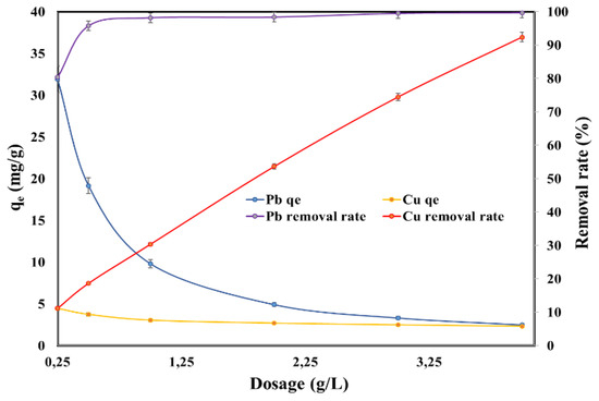 Effect of adsorbent dosage on the adsorption capacity and on the removal rate of Pb (II) and Cu (II).