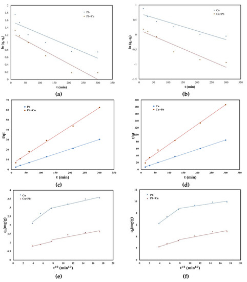 (a) Pseudo-first-order kinetic model of Pb (II) and Pb (II) in the presence of Cu (II) adsorption; (b) pseudo-first-order kinetic model of Cu (II) and Cu (II) in the presence of Pb (II) adsorption; (c) pseudo-second-order kinetic model of Pb (II) and Pb (II) in the presence of Cu (II) adsorption; (d) pseudo-second-order kinetic model of Cu (II) and Cu (II) in the presence of Pb (II) adsorption; (e) intraparticle diffusion model of Pb (II) and Pb (II) in the presence of Cu (II) adsorption; (f) intraparticle diffusion model of Cu (II) and Cu (II) in the presence of Pb (II) adsorption.