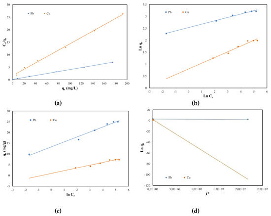 Equilibrium isotherms of Pb (II) and Cu (II) adsorption onto SSA: (a) Langmuir; (b) Freundlich; (c) Temkin and (d) Dubinin–Radushkevich.