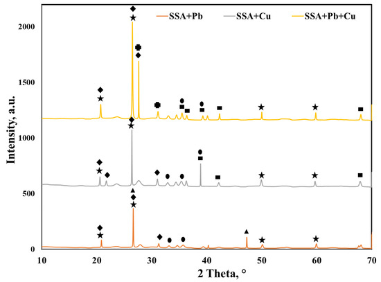 The overlapped XRD spectra of the SSA after Pb (II), Cu (II) and binary adsorption presented in Figure 8 show the formation of new crystalline phases. After Pb (II) and Cu (II) adsorption, quartz and hematite remained in the SSA. Calcium phosphate was also present in the SSA, yet the peak at 2θ = 28° could not be identified anymore.