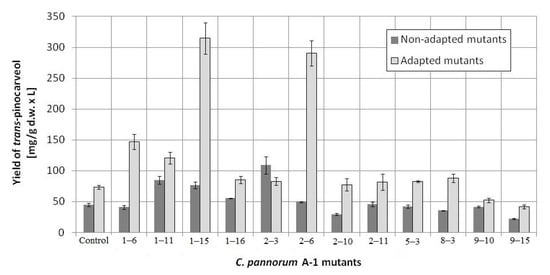 The present results demonstrate that the adapted mutants of C. pannorum A-1 are characterized by an enhanced resistance to stressful conditions. So far, however, they have shown moderate biocatalytic activities, giving relatively high trans-pinocarveol yields, which means they are still subject to optimization. The maximum trans-pinocarveol concentrations obtained in the experiment reported in the present paper were in the range of 147.2–314.7 mg/g d.w. × L. In our non-optimized flask system, we were able to biotransform of β-pinene worth US$ 0.36 to trans-pinocarveol with a value of US$ 67 (per 1 L of batch culture), using the most active mutant. This result indicates that C. pannorum A-1 and its mutants are efficient biocatalysts for the conversion of β-pinene to this valuable product. Further improvement in β-pinene biotransformation may be achieved by selecting blocked mutants of the isolated fungal strains, which would prevent further metabolization of the main product (trans-pinocarveol). Filtration-enrichment methods for selecting auxotrophs may be used for this purpose []. Moreover, optimization of the culture conditions in bioreactors is necessary for the strain to be utilized in larger scale bioconversion processes, as some parameters, such as oxygen supply or pH, cannot be controlled in a flask culture.