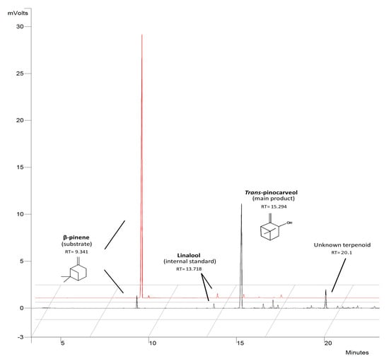 Gas Chromatography with Flame-Ionization Detection (GC-FID) chromatogram of main terpenoids obtained after 48 h of biotransformation of β-pinene by mutants of C. pannorum A-1. The initial substrate concentration was 1% (v/v). The red chromatogram refers to an abiotic control.