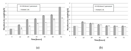 When incubated in phosphate buffer, mutant 1–6 produced an about 1.4-fold higher yield of trans-pinocarveol from β-pinene compared to the parental strain (Figure 6) (p < 0.05) (ANOVA, Tukey`s test). These two strains also differed in the optimum biotransformation time (depending on the main product), which varied from 48 to 72 h for the parental strain, and was 48 h for the mutant. The amount of dry mycelium of both strains decreased gradually over a period of 60 h after biotransformation on the buffer medium (Figure 4B), due to autolysis induced by nutrient deprivation.