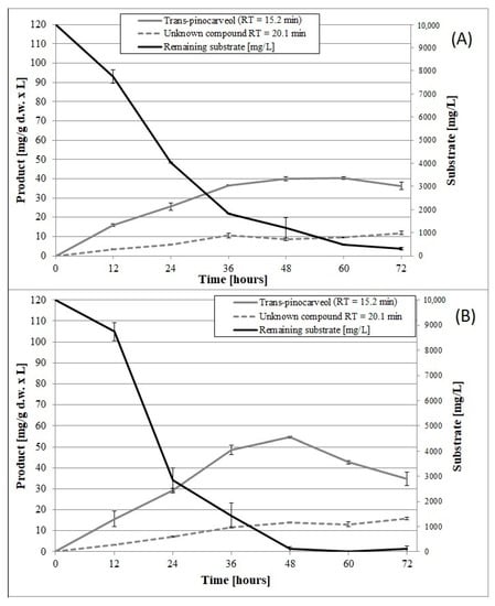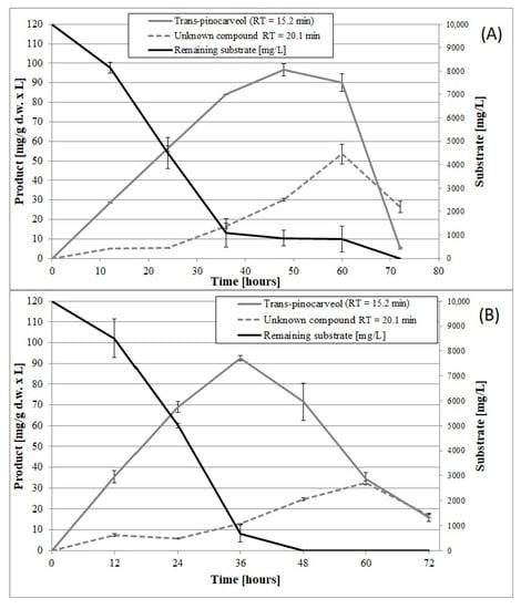 Terpenes are valuable natural substrates commonly used in the production of fine chemicals. Turpentine, obtained from biomass and also as a side product of the softwood industry, is rich in monoterpenes, such as α-pinene and β-pinene, which are widely used as raw materials in the synthesis of flavors, fragrances, and pharmaceutical compounds [,]. Oxidative transformation of abundant and low-priced monoterpenes holds considerable potential for the production of a wide variety of different terpenoid derivatives which are difficult and often costly to obtain directly from plant species. Oxygenated monoterpenes are the main flavor and fragrance impact molecules of essential oils. Many of them have beneficial effects on health [,,], including anti-inflammatory activity []. However, their high volatility, poor solubility in aqueous media, and natural toxicity to microorganisms still limit the use of these compounds in applied biocatalysis. These limitations can be overcome by slow/gradual addition of terpene into the reaction medium, use of biphasic systems containing biocompatible organic solvents or a co-solvent, and in situ product removal techniques [,,].