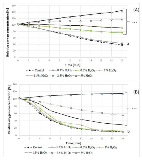 Since sublethal stresses in the β-pinene environment might induce stress-adaptive responses that could possibly make fungal cells resistant to other lethal stress factors [], in the next experiment, we examined the resistance of C. pannorum A-1 strains to hydrogen peroxide. A remarkable increase in the decomposition of H2O2 was observed for mutant 1–6 relative to the wild strain. A 3-fold higher concentration of H2O2 (1.5% v/v) was required to inhibit the metabolic activity of the mutant compared to the wild strain (0.5% v/v), as shown by detection of H2O2 (undecomposed by catalase) in the medium after 1 h incubation (Table 2). This result was confirmed by measuring the GMA of the H2O2-stressed mycelia (pre-incubated with H2O2 at concentrations of 0.1–5% v/v). The examined concentrations of H2O2 above 0.1% caused a gradual fall in the rate of oxygen uptake by parental C. pannorum A-1 (Figure 7A). Incubation in the presence of 1.0% of H2O2 led to an almost total inhibition of oxygen consumption by the mycelium of this strain. A much smaller respiration-suppressing effect was observed for mutant 1–6, for which the total inhibitory concentration of H2O2 was as high as 5% (Figure 7B). This finding shows that biotransformation of volatile terpenes can be run under unconventional oxygenation of the culture with hydrogen peroxide (H2O2) as a supplemental oxygen source [,].