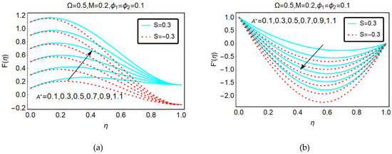 The behavior of GO-molybdenum disulfide/H2O-C2H6O2 velocities F(η) and F′(η) against the suction effects A* are shown in Figure 1. It is worthy to mention that lower end of the channel is static and downwards and apart movement of the upper end is due to S > 0 and S < 0, respectively. Moreover, the colloidal suspension between the plates due to downwards movement of the upper plate.