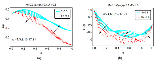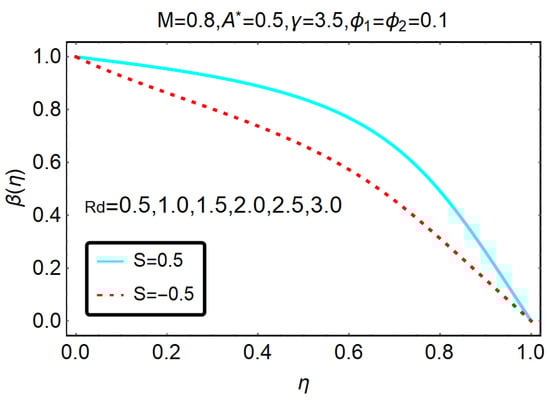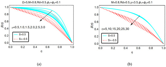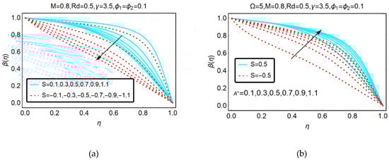 The temperature effects for alike and apart movement of the upper plate at constant suction are shown in Figure 5a. It can be seen that for the apart movement of plate, the temperature β(η) declines abruptly. Physically, the apart movement of the plate creates free space, due to which the velocity of the hybrid nanofluid declines. Due to drops in the velocity, the collision between the fluid particles decreases and rapid decrement in the temperature β(η) is detected. On the other side, when the upper plate accelerates downwards, then the collision between the fluid particles increases which produces energy between the fluid particles; consequently, the decrement in the temperature becomes slow.