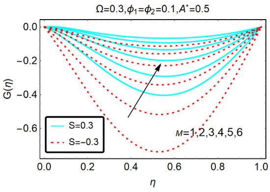 The effects of the imposed dimensionless magnetic number on the rotational velocity G(η) are decorated in Figure 4. It is pointed out that in the middle region, a back flow is produced. Physically, the suction effects from the lower plate prevail and the imposed M resists the motion. Therefore, in the middle of the channel, more back flow trends are perceived. Furthermore, when the upper plate accelerates in a backward direction, these effects are very rapid.