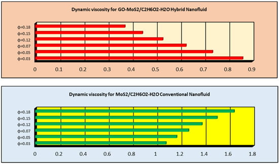 Dynamic viscosity for GO-molybdenum disulfide/H2O-C2H6O2 and MoS2/H2O-C2H6O2.