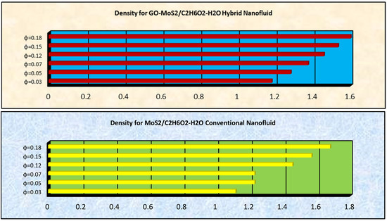 The effects of on thermophysical characteristics of GO-molybdenum disulfide/H2O-C2H6O2 and MoS2/H2O-C2H6O2 are presented in this subsection. These are shown in Figure 13, Figure 14 and Figure 15. It is examined that the dynamic viscosity of MoS2/H2O-C2H6O2 increases for higher . Similarly, the densities of GO-molybdenum disulfide/H2O-C2H6O2 and MoS2/H2O-C2H6O2 increases for high volume friction nanoparticles, which significantly alters the velocity characteristics of the nanofluids. Moreover, it is explored that the thermal conductivity of GO-molybdenum disulfide/H2O-C2H6O2 prevailed, which is significant for thermal transport properties.
