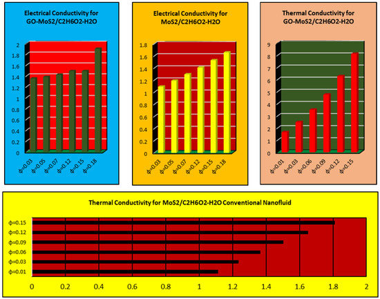 Electrical and thermal conductivities for GO-molybdenum disulfide/H2O-C2H6O2 and MoS2/H2O-C2H6O2.