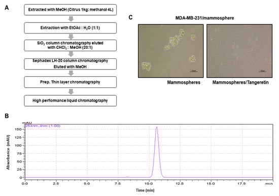 Citrus powder was extracted with 100% methanol. The bioassay-based isolation protocol is summarized in Figure 1A. The methanol extracts were mixed with water, and the methanol was evaporated. The water-suspended samples were extracted with equal volumes of ethyl acetate. The ethyl acetate-concentrated part was loaded onto a silica gel column (3 × 35 cm) and fractionated with solvent (chloroform-methanol, 20:1) (Figure S1). The three parts were divided and assayed by evaluating mammosphere formation. The #2 part potentially inhibited mammosphere formation. The #2 part was loaded onto a Sephadex LH-20 open column (2.5 × 30 cm) and eluted in three fractions (Figure S2). The three parts were obtained and assayed by evaluating mammosphere formation. Part # 3 showed inhibition of mammosphere formation. Part #3 was isolated using preparatory TLC (glass plate; 20 × 20 cm) and developed in a TLC glass chamber. Individual bands were separated from the silica gel plate. Each fraction was assayed by evaluating mammosphere formation (Figure S3). The #1 fraction was loaded onto a Shimadzu HPLC instrument (Shimadzu, Tokyo, Japan). HPLC used an ODS 10 × 250 mm C18 column (flow rate; 3 mL/min). The mobile phase was water and acetonitrile. For elution, the acetonitrile proportion was initially set at 20%, increased to 80% at 20 min and finally increased to 100% at 40 min (Figure S4).