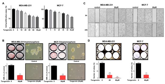 Breast cancer cells were incubated with various concentrations of tangeretin for 24 h. The antiproliferative function of tangeretin was assayed. Tangeretin inhibited cell proliferation, as shown in Figure 3A. To test whether tangeretin can suppress mammosphere formation, we treated cancer cells with tangeretin. Tangeretin inhibited mammosphere formation, as shown in Figure 3B. Tangeretin suppressed the migration and colony formation of cancer cell lines (Figure 3C,D). Our data indicated that tangeretin inhibited cancer hallmarks (proliferation, migration and colony formation) and mammosphere formation.