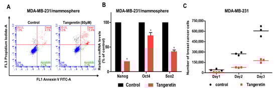 First, we purified a CSC inhibitor from citrus. Assay-based fractionation and several chromatographic methods isolated one compound from a citrus powder, tangeretin. Tangeretin is the major flavonoid of citrus. It also has antioxidant, anti-inflammatory and anticancer properties [17]. Tangeretin modestly induces apoptosis in bladder cancer cells through mitochondrial dysfunction [28]. Tangeretin and nobiletin induces G1 cell cycle arrest but not apoptosis in breast and colon cancers [29]. Nobiletin inhibits CD36-dependent tumor angiogenesis, migration, invasion and sphere formation through the CD36/Stat3/Nf-Κb signaling axis [30,31]. Quercetin suppresses breast CSCs through its inhibition of the PI3K/Akt/mTOR signaling pathway [32]. Despite numerous studies, there are no studies on tangeretin-induced antiproliferative and anti-CSC effects. Our results showed that tangeretin suppresses the proliferation of BCSCs. Tangeretin inhibited mammosphere formation in breast cancer cells (Figure 3) and modestly induced apoptosis in CSCs (Figure 4).