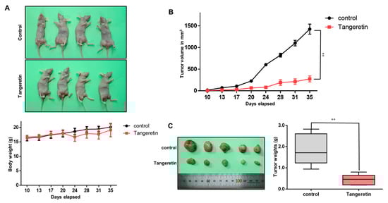 As tangeretin has antiproliferative effects, we examined whether tangeretin suppresses tumor formation in a nude mouse model. There was no significant body weight difference between control and tangeretin-treated mice (Figure 5A). At each time point, the tumor volume (Figure 5B) and weight (Figure 5C) of the tangeretin-treated nude mice were smaller than those of the untreated nude mice.