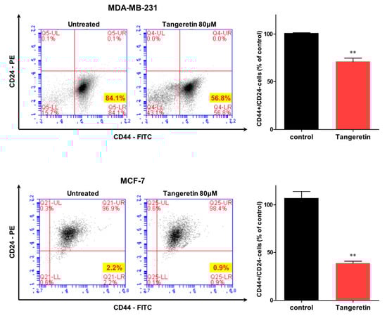 The effect of tangeretin on the CD44high/CD24low cell proportion. The CD44high/CD24low subpopulation within an MDA-MB-231 and MCF-7 cell population treated with tangeretin (80 μM) or DMSO for 24 h was analyzed by flow cytometry. For flow cytometry analysis, 2 × 104 cells were acquired. The gating was based on the binding of an antibody without tangeretin (red cross). The data from triplicate experiments are represented as the mean ± SD; ** p < 0.01.