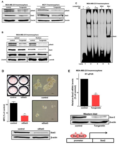 Tangeretin regulates Stat3 signaling and Sox2 regulation. (A) The total levels of Stat3 and pStat3 were measured in mammospheres composed of MDA-MB-231 cells and MCF-7 cells after treatment with tangeretin (0 or 60 μM) for 48 h using western blotting. Total lysates were subjected to immunoblot analysis with anti-Stat3 and anti-pStat3 antibodies. β-actin was used as an internal control. (B) The levels of Stat3 and pStat3 in the cytosolic and nuclear protein fractions were measured in mammospheres composed of MDA-MB-231 cells after treatment with tangeretin for 48 h using western blotting. Nuclear and cytosolic proteins were run on SDS-PAGE gels, followed by immunoblotting with anti-Stat3, anti-pStat3, anti-β-actin and anti-Lamin B antibodies. (C) EMSA was used to analyze mammosphere nuclear proteins after treatment with tangeretin. Nuclear extracts were reacted with a Stat3 probe and subjected to 6% native PAGE. Lane 1: Stat3 probe; lane 2: nuclear extracts with the Stat3 probe; lane 3: tangeretin-treated nuclear proteins with the Stat3 probe; lane 4: nuclear proteins incubated with a self-competitor oligo (100×); and lane 5: nuclear extracts incubated with a mutated-stat3 probe (100×). The arrow indicates the DNA/Stat3 complex in the mammosphere nuclear lysates. (D) Effect of Stat3 on mammosphere formation using siRNA of Stat3. Stat3-downregulated MDA-MB-231 cells were cultured for seven days using mammosphere media. Images were obtained by microscrope at 100× magnification. (E) The transcriptional level of the Sox2 gene in MDA-MB-231 was determined in tangeretin-treated mammospheres. A Sox2-specific primer was used for real-time RT-qPCR. Western blot analysis of mammosphere under tangeretin. β-actin served as an internal control. The data are presented as the mean ± SD of three independent experiments. ** p < 0.01 versus the DMSO-treated control group.