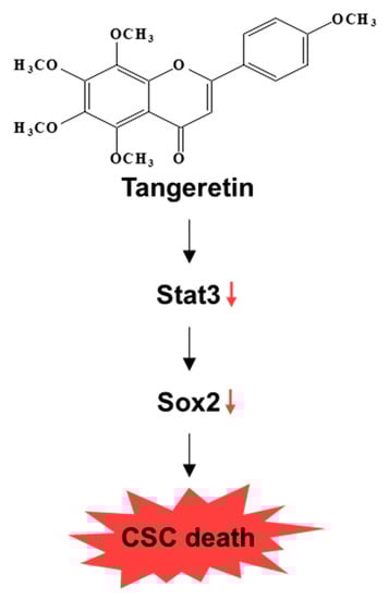 A CSC-inhibiting compound from citrus extracts was purified using silica gel, gel filtration, TLC, and HPLC. The compound was identified as tangeretin. Tangeretin inhibited cell proliferation, CSC formation and tumor growth, and modestly induced apoptosis in CSCs. The size of the CSC subpopulation (CD44+/CD24−) was reduced by tangeretin. Tangeretin reduced the total level and phosphorylated nuclear level of Stat3 Tangeretin decreased the transcript levels of Sox2 and Sox2 protein in mammospheres. Our results in this study show that tangeretin inhibits the Stat3/Sox2 signaling pathway and induces CSC death, indicating that tangeretin may be a potential natural compound targeting breast cancer.