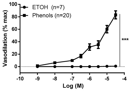 Extra virgin olive oil phenols dilate the resistance mesenteric artery (MA). Phenols from crude extra virgin olive oil (phenols) and the phenol vehicle, ethanol (ETOH), were tested on resistance mesenteric arteries isolated from rats. Data are reported as Mean ± SEM, n (experimental number). Statistical analysis was performed using two-way ANOVA, *** p < 0.001.