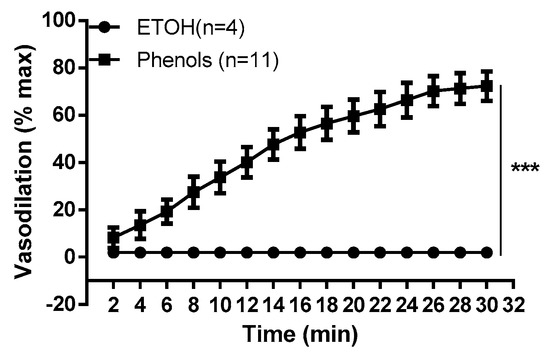 Time course of vasodilation induced by extra virgin olive oil phenols. The figure shows the time course for phenols (3 × 10−5 M) from crude extra virgin olive oil (phenols) and for the phenol vehicle, ethanol (1‰ vehicle), tested on phenylephrine-contracted resistance mesenteric arteries isolated from rats. Data are reported as the mean ± SEM, n (experimental number). Statistical analysis was performed using two-way ANOVA, *** p < 0.001.