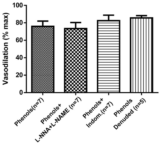 To find out the molecular mechanism underlying the EVOO-phenol-induced vasodilation, phenols were tested in a single dose (3 × 10−5 M) on MA in different conditions. Data in Figure 3 show that removal of the endothelium (denuded artery), inhibition of nitric oxide synthase (NOS) by the inhibitors l-NAME and l-NNA, or inhibition of the cyclooxygenase (COX) by indomethacin did not affect the EVOO-phenol-induced vasodilation, which was similar to that in control vessels.