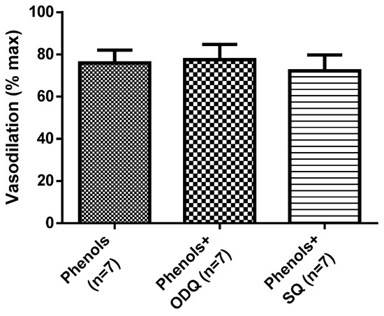 Further, EVOO phenols were also tested on MA in the presence of the guanilate cyclase inhibitor, ODQ, or in the presence of the adenilate cyclase inhibitor, SQ. Neither inhibition of cyclic adenosine monophosphate (cAMP) nor cyclic guanosine monophosphate (cGMP) production interfered with the vasodilation induced by EVOO phenols (Figure 4).