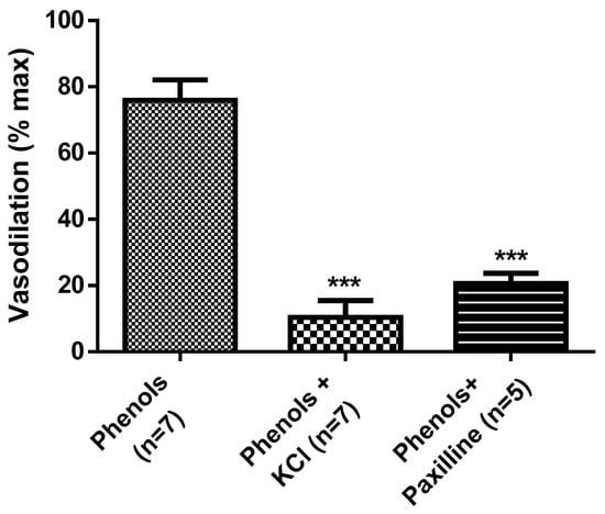 To determine if EVOO-phenol-induced vasodilation was mediated by hyperpolarization, phenols were tested in MA contracted by KCl, showing that the vasodilation was significant (p < 0.001) decreased (Figure 5). Further, the results in Figure 5 show that EVOO-phenol-induced vasodilation of 76% ± 6.1% was significant reduced to 21% ± 2.6% (p < 0.001) in the presence of the BKCa2+ channel inhibitor, paxilline.