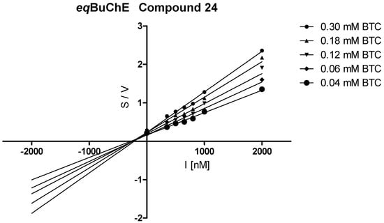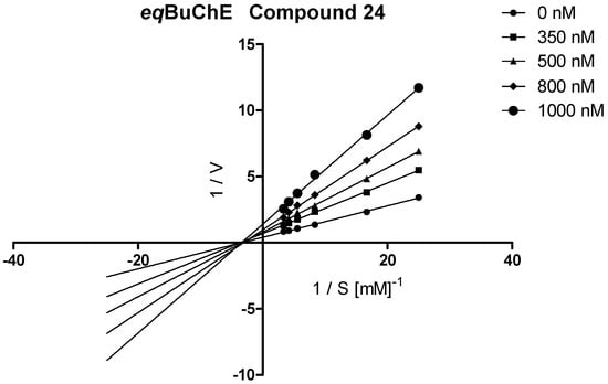 | Compound | R | % Inhibition +/− Ϭ a | IC50 eeAChE b [µM] +/− SEM c | % Inhibition +/− Ϭ | IC50 eqBuChE d [µM] +/− SEM | |