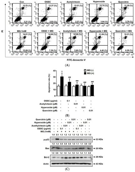 Effects of the OSSC extract and its maker compounds on MG-induced apoptosis. (A) Annexin V and PI staining; (B) percent rate of apoptosis. Data are expressed as the mean ± S.E.M. (n = 3). ** P < 0.01 vs. control; ### P < 0.001 vs. MG; (C) expression of apoptosis-related proteins (p-p53, Bax and Bcl-2). Actin as the loading control.