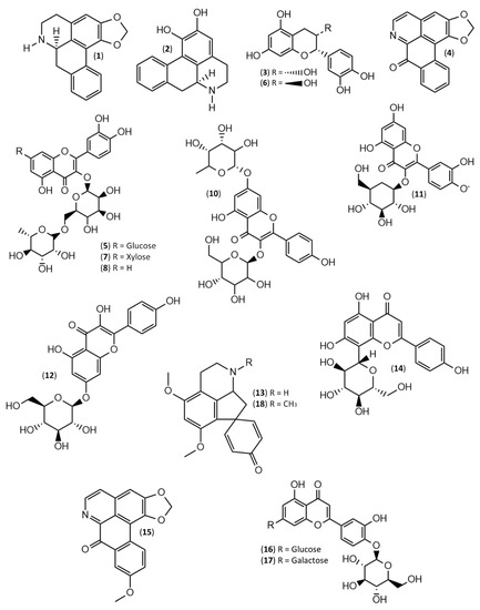 - Lúcio, A.S.S.C.; da Silva Almeida, J.R.G.; da-Cunha, E.V.L.; Tavares, J.F.; Barbosa Filho, J.M. Alkaloids of the Annonaceae: Occurrence and a compilation of their biological activities. In The Alkaloids: Chemistry and Biology; Elsevier: Amsterdam, The Netherlands, 2015; Volume 74, pp. 233–409. ISBN 1099-4831. [Google Scholar]