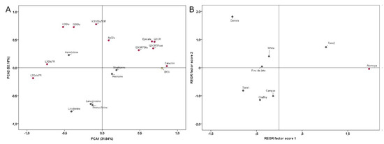 Scatter plot of the principal components (PC1 and PC2) factor scores calculated on the PCA of phenolic and alkaloid compounds of the seven extracts of Cherimoya and Atemoya leaves. PCA was performed using the data matrix in Table 2 obtained with HPLC-DAD-ESI-MS/MS analysis. Panel A represent the partitioning of the different compounds based on PC1 and PC2 factor scores. Panel B represent the partitioning of the different genotypes and cultivars according to their chemical composition.