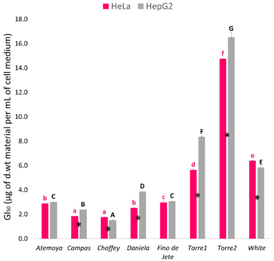 Antiproliferative activity of the seven extracts of Cherimoya and Atemoya leaves against HeLa and HepG2 tumor cell lines. Cell growth was measured by MTT assay after 48 h of treatment with different concentrations of each leaf extract and was expressed as GI50 (µg of d.wt. weight per mL of cell medium). In the histogram, each column represents the mean ± SD of three independent experiments. Among the same series (HeLa or HepG2), different letters indicate significant differences at p ≤ 0.05 as measured by Tukey’s multiple range test. Letter “a” denotes the highest antiproliferative activity. “*” indicates statistical differences between the two cancer cell lines. For additional statistical analysis information see Supplementary Table S3.