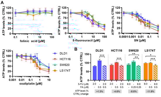 In the first step, dose-response curves for each drug were established in four human CRC cell lines (DLD1, HCT116, SW620, and LS174T). The cell lines differed in biological characteristics such as genetic stability and mutation status (Table 1). Drug activities were compared by measuring the cell metabolic activity, presented as % of control (sham-treated, CTRL), which indirectly corresponds to cell viability. All cell lines marginally varied in their sensitivity to all chemotherapeutic drugs and 5-FU, SN, and OX diminished ATP levels in a dose-dependent manner, whereas the vitamin FA was inactive in the range of concentrations tested (Figure 2A).