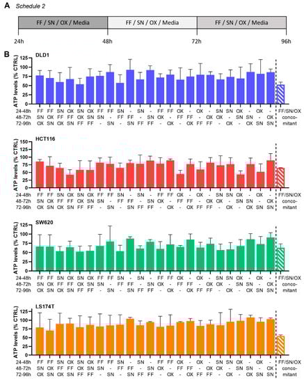 As a positive control, we used three-drug (FA/5-FU/SN or FA/5-FU/OX) or four-drug (FA/5-FU/OX/SN) combinations applied at clinically used doses (CUD), converted to in vitro units (see Section 4). The ODCs were administered 24 h after cell seeding and kept concomitantly for 72 h (Figure 3D, Schedule 1). The doses of the ODCs were mostly much lower compared to the CUD, especially for 5-FU (5-fold in DLD1 and HCT116 cells) or SN (33-fold in HCT116 cells), see Table 3. All ODCs presented a more potent activity than the corresponding monotherapies. In contrast to the CUD, the activity of the ODC is not promoted by one drug only, but by the synergistic or additive interplay of the combined drugs at optimized doses. The four-drug combination FA/5-FU/OX/SN inhibited the ATP levels up to 80%, (HCT116 cells, Figure 3E, administrated concomitantly, Schedule 1). Of note, the three-drug combinations FA/5-FU/SN and FA/5-FU/OX, administered at CUD, were similarly active to the four-drug combination FA/5-FU/OX/SN. The activity of monotherapies at corresponding doses was mild to strong (e.g., 60% for SN and OX in HCT116 cells), Figure 3E.