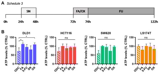Validation of the drug combinations in a clinically used drug administration schedule. (A) Schematic representation of an intermittent drug administration schedule extrapolated from a clinical setting (Schedule 3). CRC cells were seeded and kept without treatment for 24 h. Afterward, the culture medium was removed to apply SN for 24 h, followed by the removal of used cell culture medium and addition of fresh medium for another 24 h. Starting at 72 h post-experiment initiation, the cell culture medium was replaced by a combination of FA/OX, kept for 2 h, and then replaced by 5-FU for another 48 h. The entire procedure lasted for 122 h. (B) Drug combination efficacy on cell metabolic activity in each of the cell lines. Error bars represent the SD for N = 3 experiments and significances of * p < 0.05 represent the comparison with the full combination for all cell lines by a one-way ANOVA with post-hoc Dunnett’s multiple comparisons test.