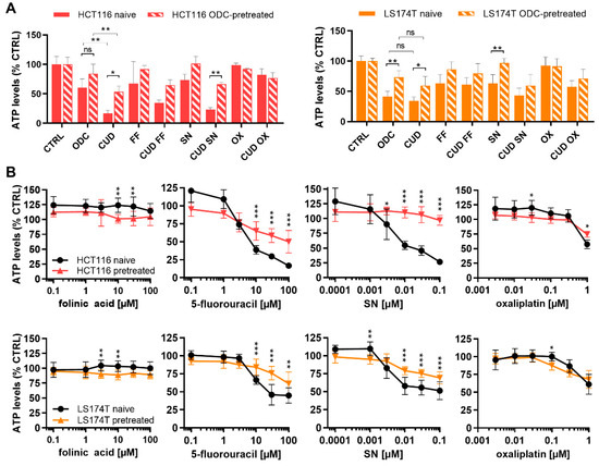 Drug combination activity in chronically ODC-pretreated cells. (A) Drug combination efficacy of the ODC and CUD on cell metabolic activity in HCT116 and LS174T naïve and FA/5-FU/SN/OX pretreated cells (HCT116-pretreated and LS174T-pretreated). (B) Drug dose-response curves of folinic acid (FA), 5-fluorouracil (5-FU), SN and oxaliplatin (OX) in HCT116 and LS174T naïve and FA/5-FU/SN/OX pretreated cells. Drug concentrations are presented on a logarithmic scale. Error bars represent the SD and significances of * p < 0.05, ** p < 0.01 and *** p < 0.001 represent the comparison between naïve and pretreated cells (unpaired t-test) or the comparison between the ODC and CUD (two-way ANOVA with post-hoc Dunnett’s or Sidak’s multiple comparisons test) including (A) N = 3 or (B) N = 3–4, respectively.