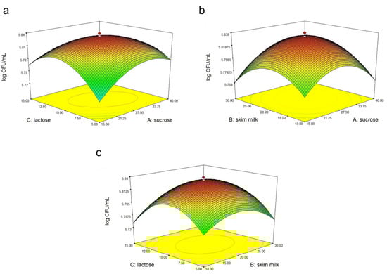 Figure 2 shows the response surface curves plotted in function of two factors while the third was maintained constant at its main level. Based on the three graphs plotted in Figure 2, the maximum cell viability after freeze-drying was predicted at 5.839 log CFU/mL when lactose (10% w/v), sucrose (27.5% w/v), and skim milk (20% w/v) were used as the combined protective agents for P. polymyxa Kp10. This suggests that the combination of lactose and sucrose could give a synergetic effect in protecting the cells during the process. In addition, it can be seen that the combinations from the selected protective agents provided a synergic effect in maintaining high cell viability after the freeze-drying process. Sucrose was reported to replace water around polar residues in macromolecular, thus stabilizing cell membranes and proteins during desiccation [35]. Sugars from disaccharides could preserve cell structure by hydrogen bond formation that maintains tertiary protein structure when water molecules are absent [36]. Meanwhile, skim milk rich in protein is capable of preventing cells from injury caused by extracellular ice formation during the freezing stage by providing a protective coat to the cells [32]. The survival rate of cells after freeze-drying for lactose (10% w/v) and sucrose (27.5% w/v) was 83%. According to Wong et al. [37], 71.65%–82.07% of survival rates can be obtained when using different skim milk and sugar combinations as protectants. This supported the survival rate of L. salivarius at 83%–85% when a combination of skim milk, trehalose, and sucrose was used as a protective agent [37]. In this study, a combination of skim milk, sucrose, and lactose gave a significant effect on cell viability after the freeze-drying process by maintaining maximum cell viability.