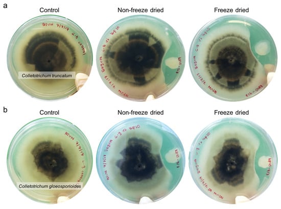 Figure 3. In vitro antifungal activity of P. polymyxa Kp10 against (a) C. truncatum and (b) C. gloeosporioides.