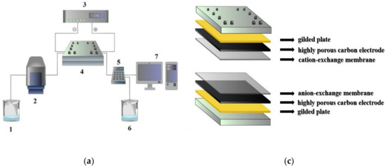 Scheme (a) and photo (b) of laboratory setup: 1—salt solution; 2—peristaltic pump; 3—potentiostat; 4—cell; 5—conductivity; 6—effluent; and 7—computer; scheme (c) and photo (d) of electrochemical cell.