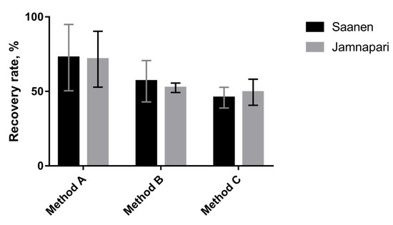 The protein recovery rate of each extraction method is presented as a percentage of extracted protein concentration calculated against skim milk protein concentration. Error bars are from Bradford assay technical replicates and presented as SD (n = 3).