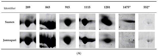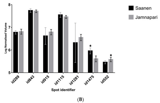 Five spots (protein ID 289, 843, 915, 1115, and 1281) were present in both breeds, with no significant differences in their levels, and two spots (protein id 1475 and 552) showed significant differences in their abundance levels when analyzed by Progenesis SameSpot software (Nonlinear Dynamic Ltd., Durham, NC, USA) (Figure 5A,B). Spot 1475 level was significantly higher in Saanen milk than Jamnapari, while spot 552 was significantly more abundant in Jamnapari milk than Saanen milk (Figure 5B).