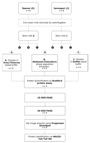 Three different extraction methods were compared in this study on goat’s milk samples from two different breeds. The urea/thiourea-based method (method A), methanol/chloroform-based method (method B) and sulfite-based method (method C) were tested to ascertain the most fitting extraction method for the 2DE analysis of the goat’s milk samples. Milk samples of each breed were pooled from six biological replicates and divided into three technical replicates. Extraction methods A, B, and C, on each milk sample per breed, were performed in triplicates. An outline of the designed experiment for extraction methods is summarized in Figure 6.