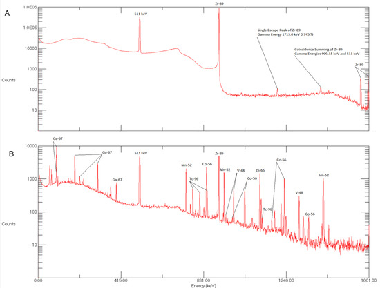 The radionuclidic purity of 89Zr mainly depends on the purity of the target material and irradiation conditions. The [89Zr]zirconium oxalate solution was tested for radionuclidic identity and purity using a high purity germanium (HPGe) detector (Figure 3A). The analysis showed the presence of 909 and 511 keV peaks. No additional radioactive contamination was detected. In these studies, the radionuclidic purity of the isolated 89Zr fractions was found to be >99.99%. Similar values for radionuclidic purity have been reported by other authors [1,14,20].