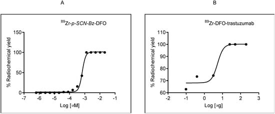 Radiolabeling experiments were performed as described in the literature [3,19]. To obtain the quantitative radiolabeling yield and to determine specific activity, several reactions with different concentrations of DFO-trastuzumab were performed and analysed on iTLC (Figure 4A,B). Reported specific activities of 89Zr-DFO-trastuzumab typically range from 0.067 to 0.296 MBq/µg [20,22,23].