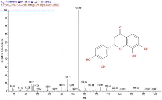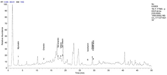 The total ion chromatograms (TIC) of the compounds identified in the sample of Clinacanthus nutans ethanolic leaf extract (CELE) are demonstrated in Figure 1. The identities of eight compounds were determined along with their retention time, protonated molecular ions and characteristic fragment ions (Table 1). The compounds identified based on the LC-MS and MS/MS data analysis include myricetin, orientin, isoorientin, vitexin, isovitexin, isookanin, apigenin and ferulic acid (Table 1). The total ion chromatogram and the structure of the eight compounds identified are presented below, in Figure 1, Figure 2, Figure 3, Figure 4, Figure 5, Figure 6, Figure 7, Figure 8 and Figure 9. The compounds were identified by comparing their masses (m/z), fragment ions and mass spectra with those reported in the mass bank (metabolite database).