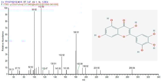 The three additional compounds identified in this study were also reported to have various pharmacological activities. Myricetin is one of the common plant derived flavonoids that is well known for its nutraceutical activities [34]. It is one of the naturally occurring phenolic compounds in fruits, berries, vegetables, teas, medicinal plants and wines produced from various plants [34,35]. Myricetin was first isolated in India from the bark of Myrica nagi Thunb. (Myricaceae) as light yellow-coloured crystals [36]. The compound is recognised mainly for its iron-chelating, anticancer, antioxidant, anti-inflammatory and antidiabetic activities among others [34,37].