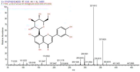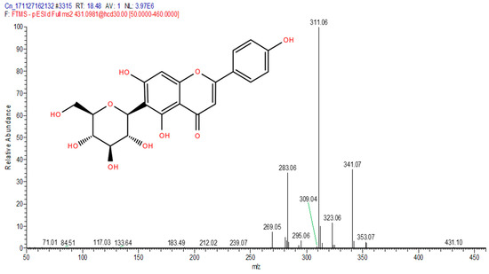 Orientin is a water-soluble flavonoid C-glycoside that is chemically known as 2-(3,4-dihydroxyphenyl)-5,7-dihydrox-y-8[(2S,3R,5S,6R)-3,4,5-trihydroxy-6-(hydroxymethyl)]chromane-4-one. The compound has been isolated from different medicinal plants including Ocimum sanctum, Phyllostachys species (bamboo leaves), Passiflora species (passion flowers), Trollius species (Golden Queen) and Jatropha gossypifolia (Bellyache Bush) [33]. Orientin has been reported to be associated with various pharmacological activities including antibacterial, antiviral, anti-inflammatory, antioxidant and antiageing, among others [33]. Moreover, isoorientin is a flavone that is a 6-C-glucoside of luteolin. It has been reported to have antidiabetic, anti-inflammatory, proapoptotic and antioxidant activities.