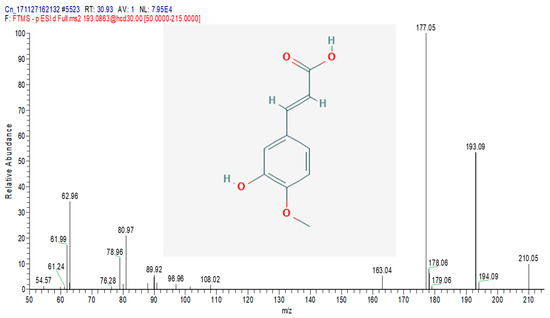Ferulic acid belongs to the phenolic acids group that are commonly found in plant tissues [38]. It is mostly found in whole grains, grapes, parsley, spinach, oats, rhubarb and barley [39]. Similarly, ferulic acid was reported to have several physiological functions ranging from antioxidant, anti-inflammatory, antimicrobial, antidiabetic and anticancer activities [39]. It is also widely used in skin care formulations as a photoprotective agent and as an anti-skin photoageing process. However, ferulic acid is reported to have a high tendency for rapid oxidation [39,40,41,42], which could make it prone to toxicity and oxidative stress.